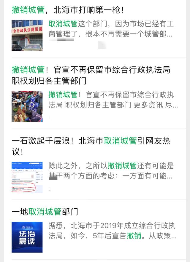在网上,北海市发布的《停止公告》也被不少网友解读为北海市取消了城管部门。