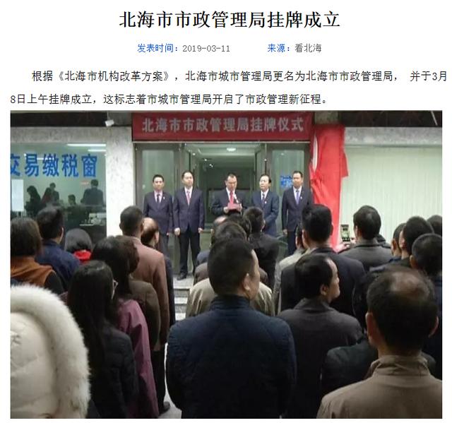 纵览新闻记者查询资料了解到,根据公众号“北海市政”2019年3月8日消息,根据《北海市机构改革方案》,北海市城市管理局更名为北海市市政管理局,并于2019年3月8日上午挂牌成立。该公众号同日发布的消息还称,2019年3月8日上午,北海市综合行政执法局也举行了挂牌仪式,根据《北海市机构改革方案》住房和城乡建设、自然资源、交通运输、生态环境、工业和信息化、旅游文体广电、商务、人力资源和社会保障等11个领域的行政执法职责整合,组建市综合行政执法局,作为市政府的工作部门。