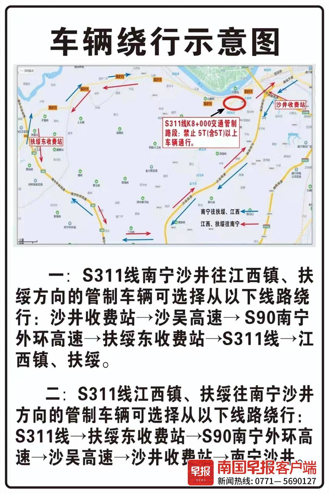 (二)S311线江西镇、扶绥往南宁沙井方向的管制车辆可选择从以下线路绕行:S311线→扶绥东收费站→S90南宁外环高速→沙吴高速→沙井收费站→南宁沙井。