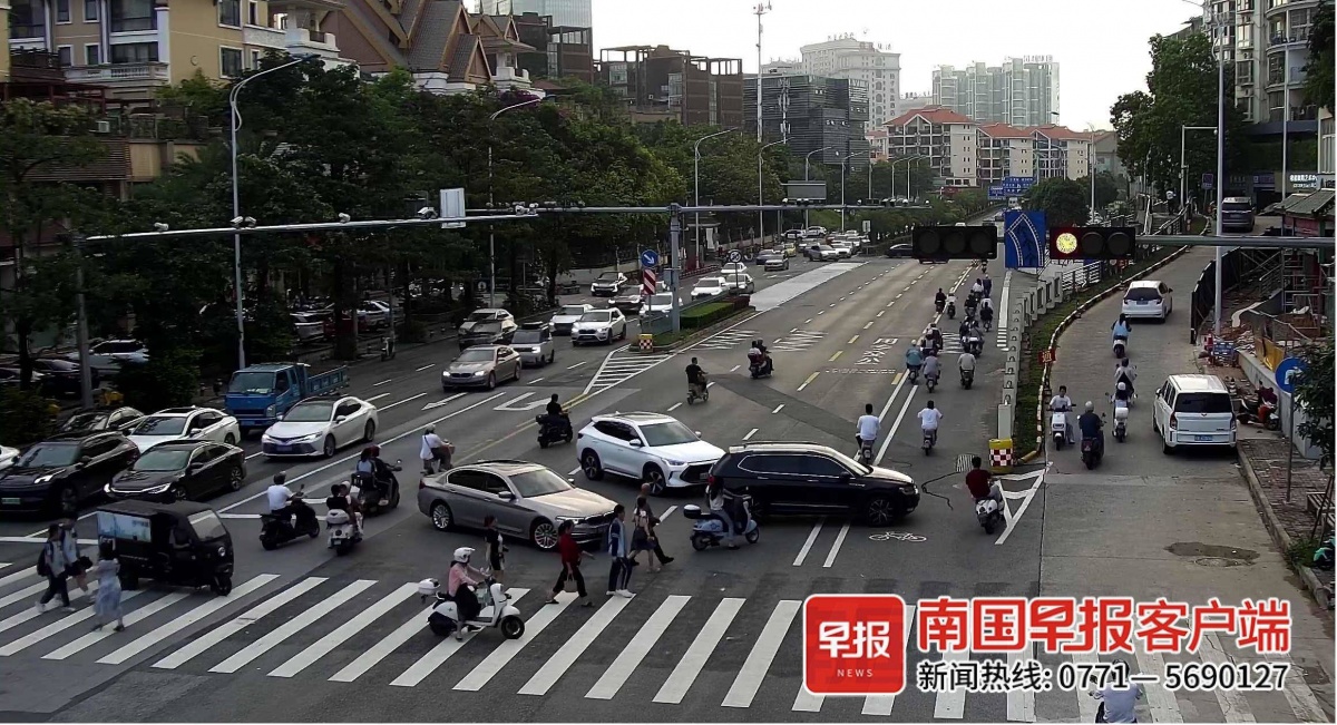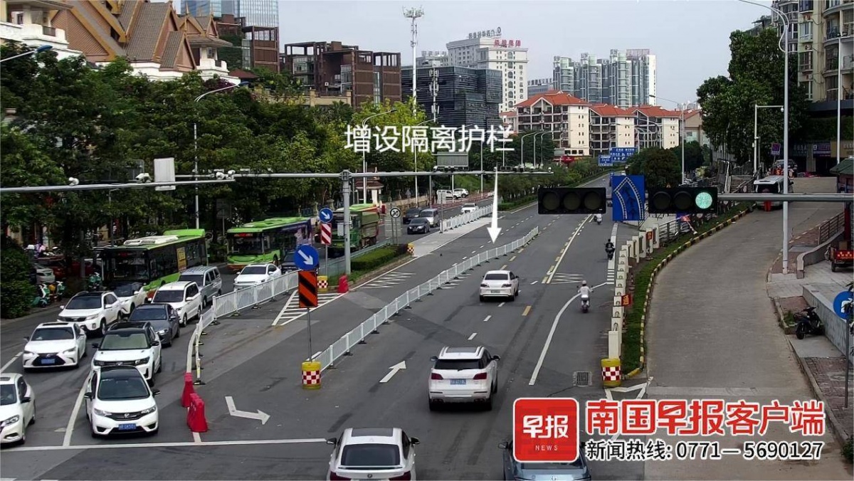 对此,南宁交警部门采取“无干扰掉头+借道左转”措施,即通过在北出口增设隔离护栏,分隔掉头与对向直行车辆,利用掉头口至路口之间路面引导左转车流驶入中分带左侧通行,从而实现北进口掉头、左转与直行车辆的分离,互不干扰。