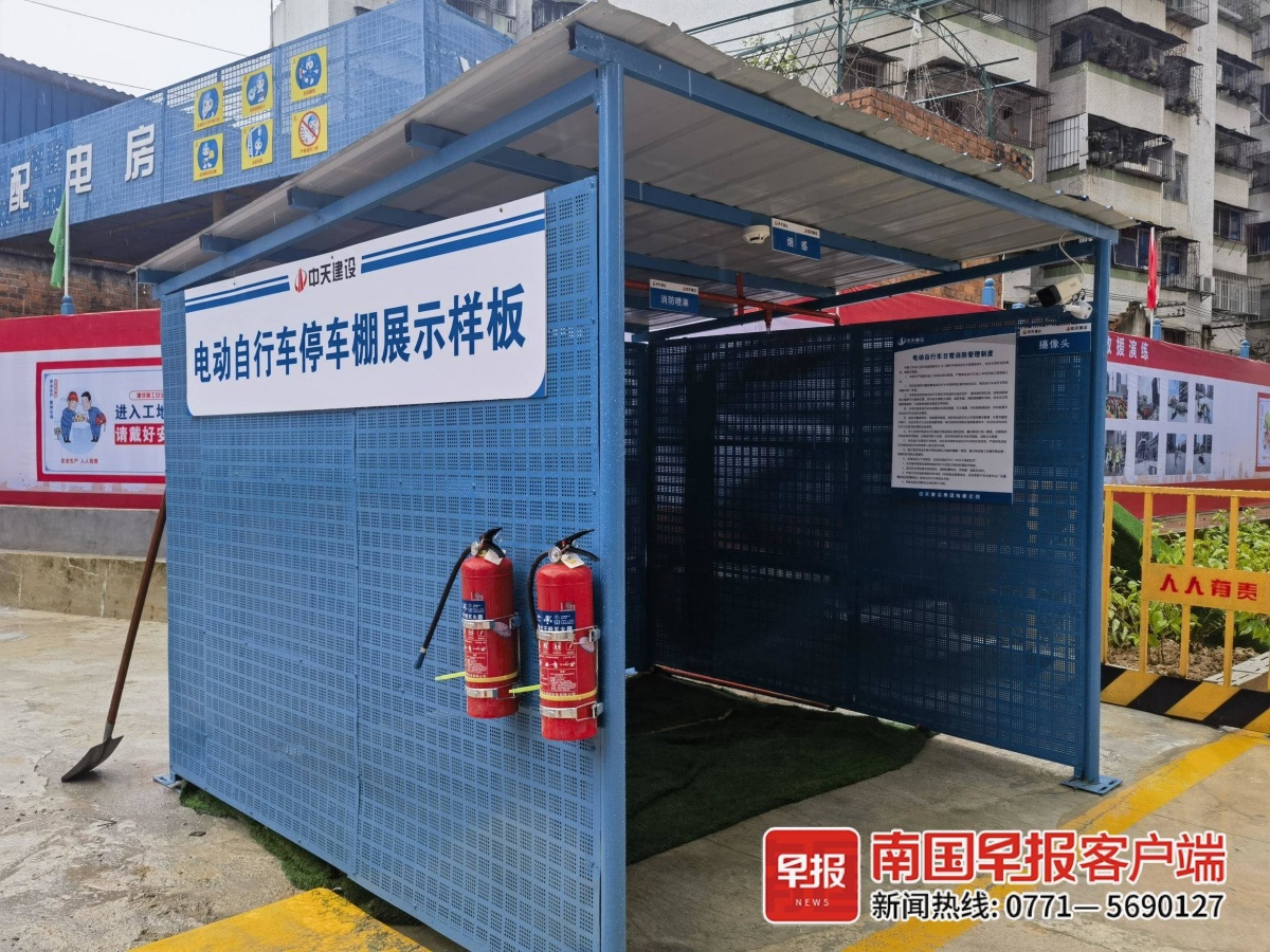 ▲电动车停放棚展示样板。记者 李俭芹 摄