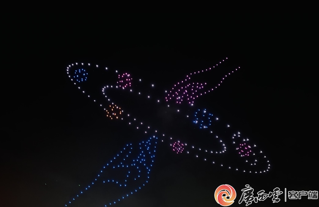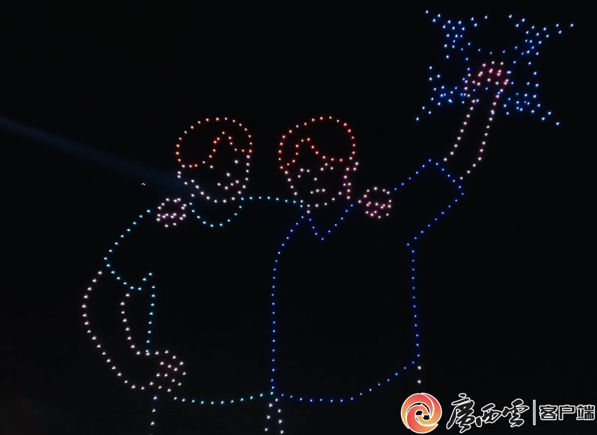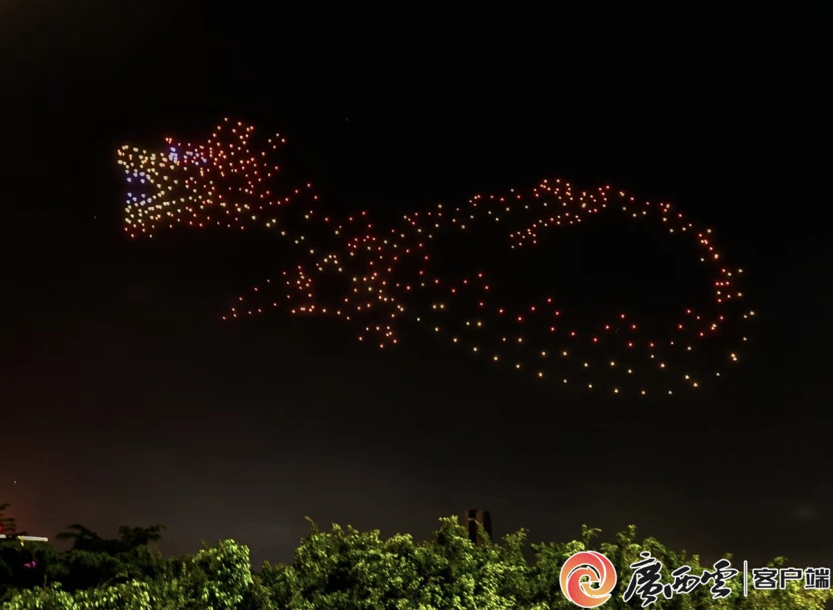 广西云-广西日报讯(记者 谭晓林 实习生 徐浩开)“哇!快看,无人机变出一条龙了!”6月15日晚,南宁民生旅游码头星光璀璨,500架无人机翩翩起舞,在夜空中变幻出壮美广西、爱在南宁、龙凤飞舞、朱槿花开及奔跑的奋进者等各种流光溢彩的图案,市民们欢呼着高举手机,记录下这场充满惊喜的大型无人机灯光秀。