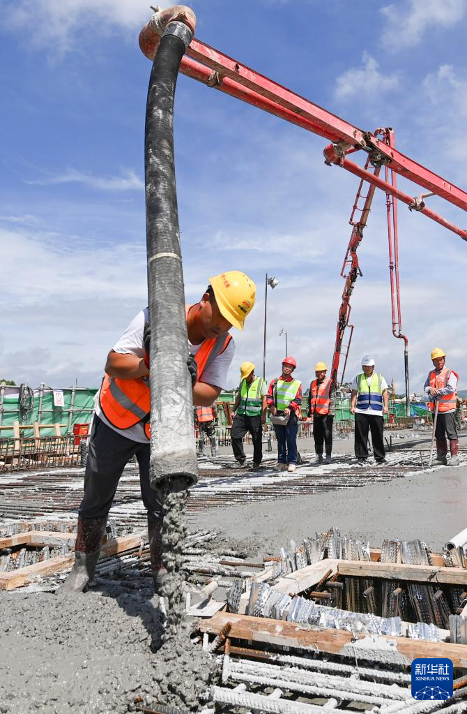 图为中铁十四局三公司工人在飞行区桥梁浇筑作业中。新华社记者 陆波岸 摄