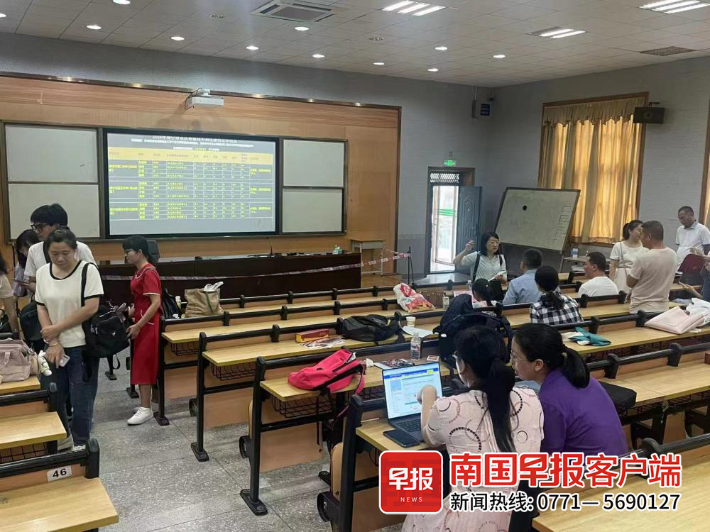 在南宁三中信息公示点,大屏幕前汇聚了众多期待的目光,滕女士一家便是其中之一。滕女士的儿子小郭,手持笔记本电脑,每隔一段时间就会刷新一下页面,查看自己在学校中的录取排名是否有新的变动。滕女士说,现场有老师可以咨询,这让她更安心。