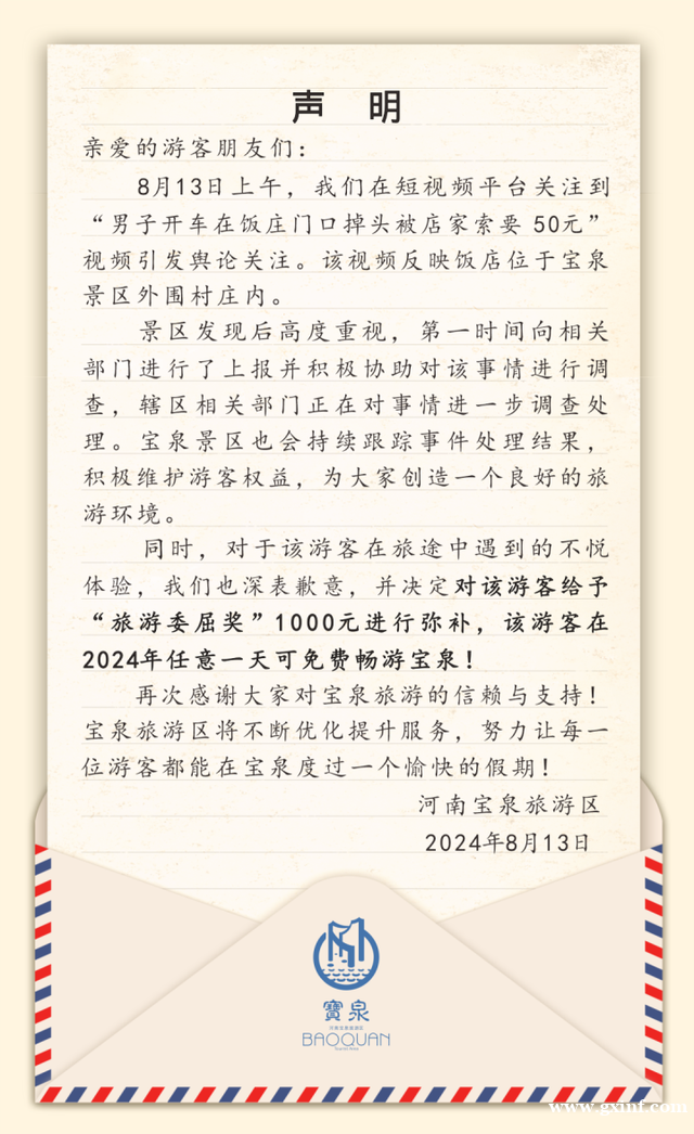 同时,对于该游客在旅途中遇到的不悦体验,我们也深表歉意,并决定对该游客给予“旅游委屈奖”1000元进行弥补,该游客在2024年任意一天可免费畅游宝泉!